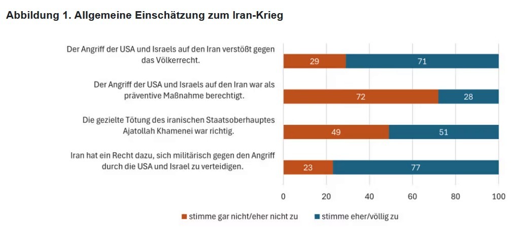 "Laut der Ende März 2026 durchgeführten Umfrage unter 2.492 Personen bewerten 71 Prozent der Befragten den Angriff der USA und Israels auf Iran als ungerechtfertigt und als Verstoß gegen das Völkerrecht."